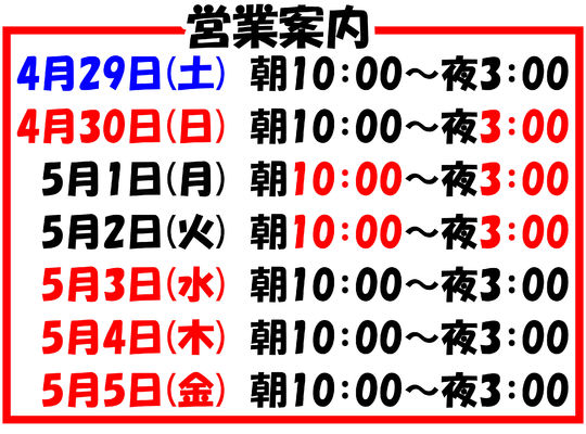 2023/04/28都城のカラオケ店【トイボックス】の4月29日(土)から5月5日(金)までの営業時間をご案内致します!(^^)! 4月29日(土) 朝10:00~夜03:00 4月30日(日)...